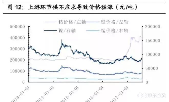 虽然中短期下游弹性较低但下游对中游以及上游环节的带动较为显著,中游环节锂电池处于持续扩产能阶段,而上游原材料钴矿,锂矿、镍矿等均属于国家战略性矿产资源,尤其是钴国内较为稀缺, 2016年全球钴矿产量为10.1万吨,产量增速由过去的 10%以上下滑至 3.06%,我国钴储量仅占全球 1.11%,属于钴资源短缺型国家,每年需求的 80-90%钴原料需由刚果进口补给。