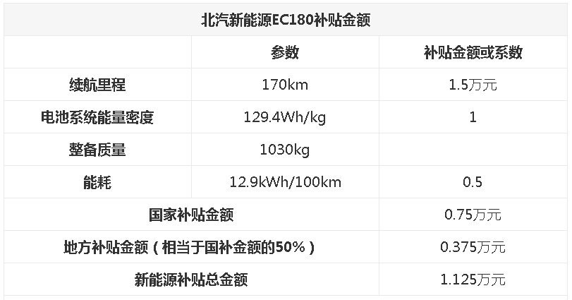 北汽新能源的EC180是去年国内销量最高的纯电动车型。它是一款微型纯电动汽车,按照我们之前的分析,它将是补贴新标准的“受害者”。实际情况如何呢?它到底能够拿到多少补贴?