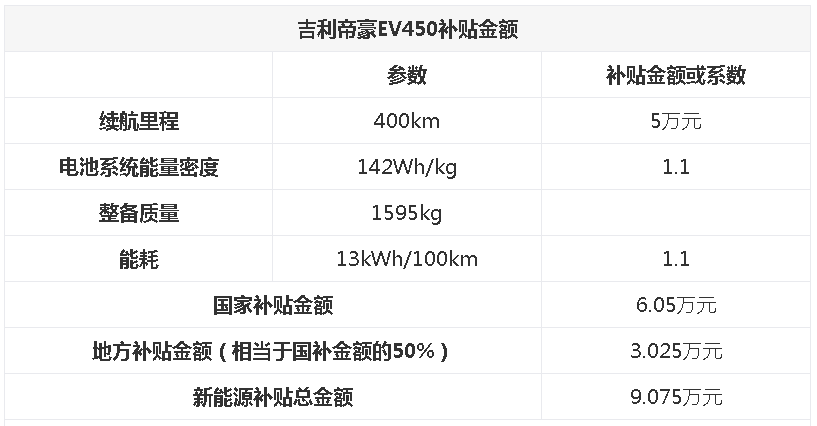 吉利帝豪EV450是最新的纯电动汽车,各项参数名列前茅。通过帝豪EV450,我们可以看到技术领先的车型能够拿到多少补贴。(注:按半年前公布的目录,帝豪EV450的电池系统能量密度是135.4Wh/kg,但是最近厂家公布的数据是142Wh/kg。这里取的是厂家数据,也许在过去半年里技术又有进步。)