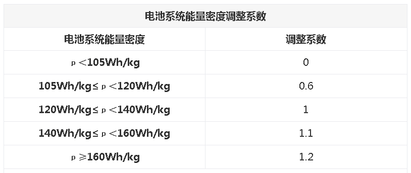也就是说,补贴减少了,同时门槛也提高了,光续航里程达标了还不行,电池能量密度和车辆能耗水平也要达标。先来看看电池系统能量密度调整系数的详细设定。