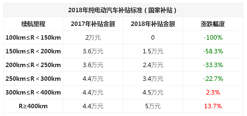 根据国家财政部发布的2018年的新能源汽车补贴标准,新能源汽车的补贴金额将普遍下降,微型纯电汽车将受到重大打击,只有续航里程超过300km的中高端纯电动车型能够从新政当中获益。