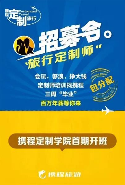 记者近日获悉,携程旗下定制旅行平台近日发布了“定制师招募令”,为了满足暴增的定制旅游需求,专门成立国内首个“定制学院”,面向社会个人特别是应届毕业生招生,计划在一年内招收培训3000名定制师,为全国定制旅行供应商输送人才,以服务需要定制游的个人、家庭、企业用户。