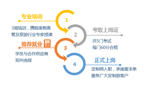 在毕业分配上,携程也提前做了规划,参加3周培训、通过5门考试获得上岗证后,将通过举办专场招聘会等方式,协助准定制师与供应商签约,成为正式上岗的定制师。