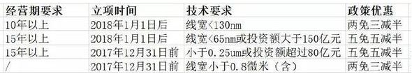 2017年12月31日前设立但未获利的集成电路线宽小于0.25微米或投资额超过80亿元,且经营期在15年以上的集成电路生产企业,自获利年度起第一年至第五年免征企业所得税,第六年至第十年按照25%的法定税率减半征收企业所得税,并享受至期满为止