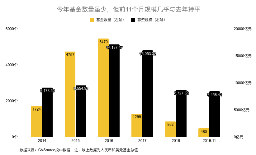 2019年基金数量虽少,但前11个月规模几乎与去年持平。CVSource投中数据显示,今年前11个月共有480支基金人民币与美元基金募得总数为8458.4亿元的资金,接近2018年862支基金募集的8727.38亿元。平均下来,今年前11个月每支基金平均募资17.62亿元,高于过去5年的平均水平。