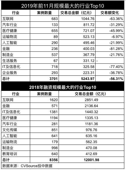 和2018年相似,2019年投资人的钱流向的主要投资领域集中在互联网、汽车、健康医疗、运输物流等行业。CVSource投中数据显示,2019年1-11月,规模最大的十大行业共拿到5243亿元融资,占前11个月整体交易的七成。