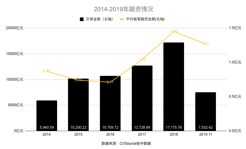 CVSource投中数据显示,2019年前11个月交易频次仅5916次,不足2018年全年1/2。但平均下来单笔投资并不没有减少。具体来看,2019年平均每笔融资达1.27亿元,为2014年以来第二高——低于2018年的1.45亿元。