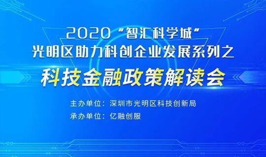 10月20日,由深圳市光明区科技创新局主办、亿融创服承办的【2020“智汇科学城”光明区助力科创企业发展系列之科技金融政策解读会】将在深圳市光明区举办。本次会议政策解读将邀请光明区科技创新局科技金融负责人:艾之涛针对科技型中小企业的科技金融扶持政策进行解读和答疑,与区内企业、意向落地光明区企业、金融机构进行深入的线上、线下的分享交流,在线解答,助力区内企业发展。